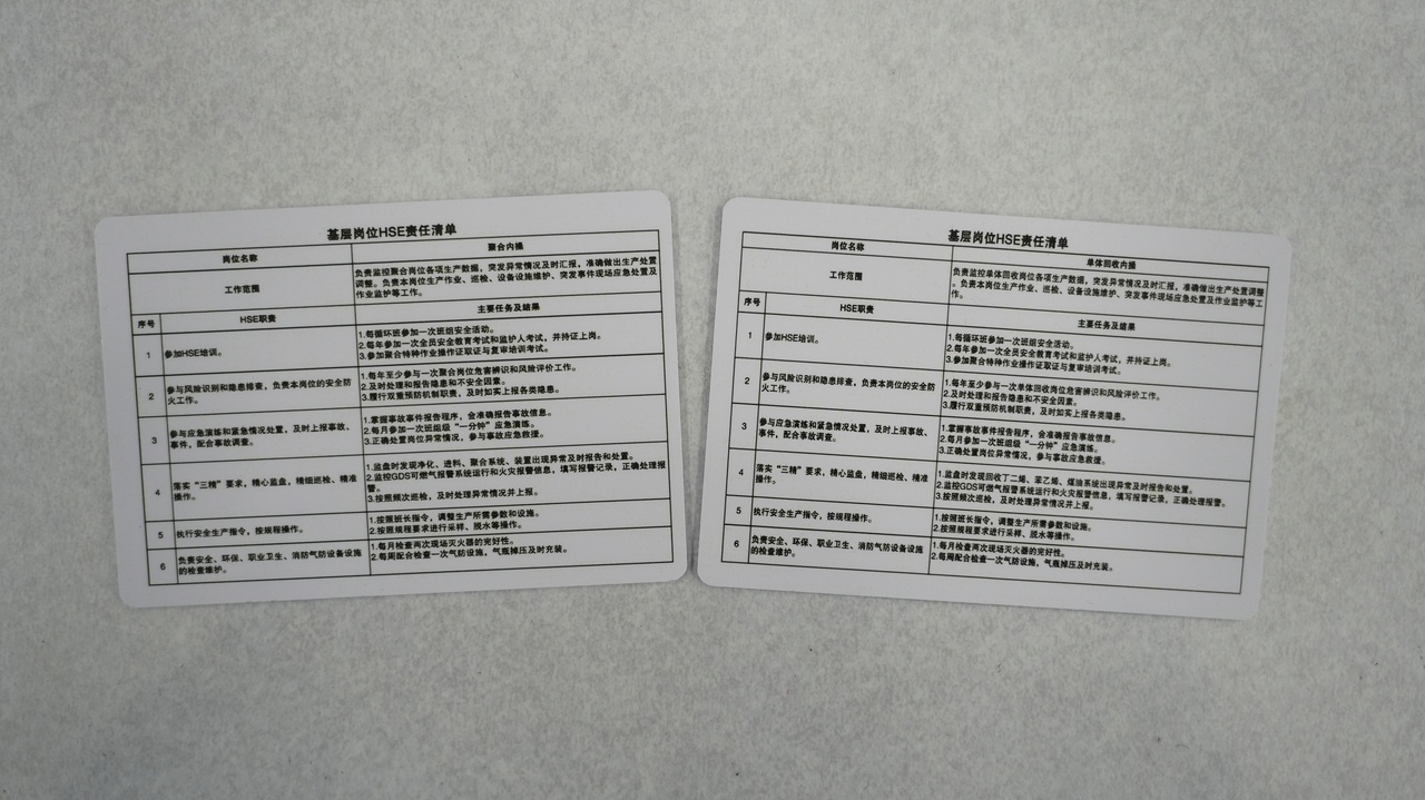 据了解,为帮助新入职员工快速掌握岗位核心要点,该厂深入一线调研,系统梳理了各装置岗位的操作流程、安全规范、应急处置等关键内容,去繁就简,提炼形成“短、实、新”的条款,并制成塑封卡片。该卡耐磨损、易携带,更实现了职责内容的可视化、便携化,使员工能够随时查阅、对标操作,有效解决了传统手册翻阅不便、重点不突出的问题,让岗位职责真正“看得见、记得牢、用得上”。